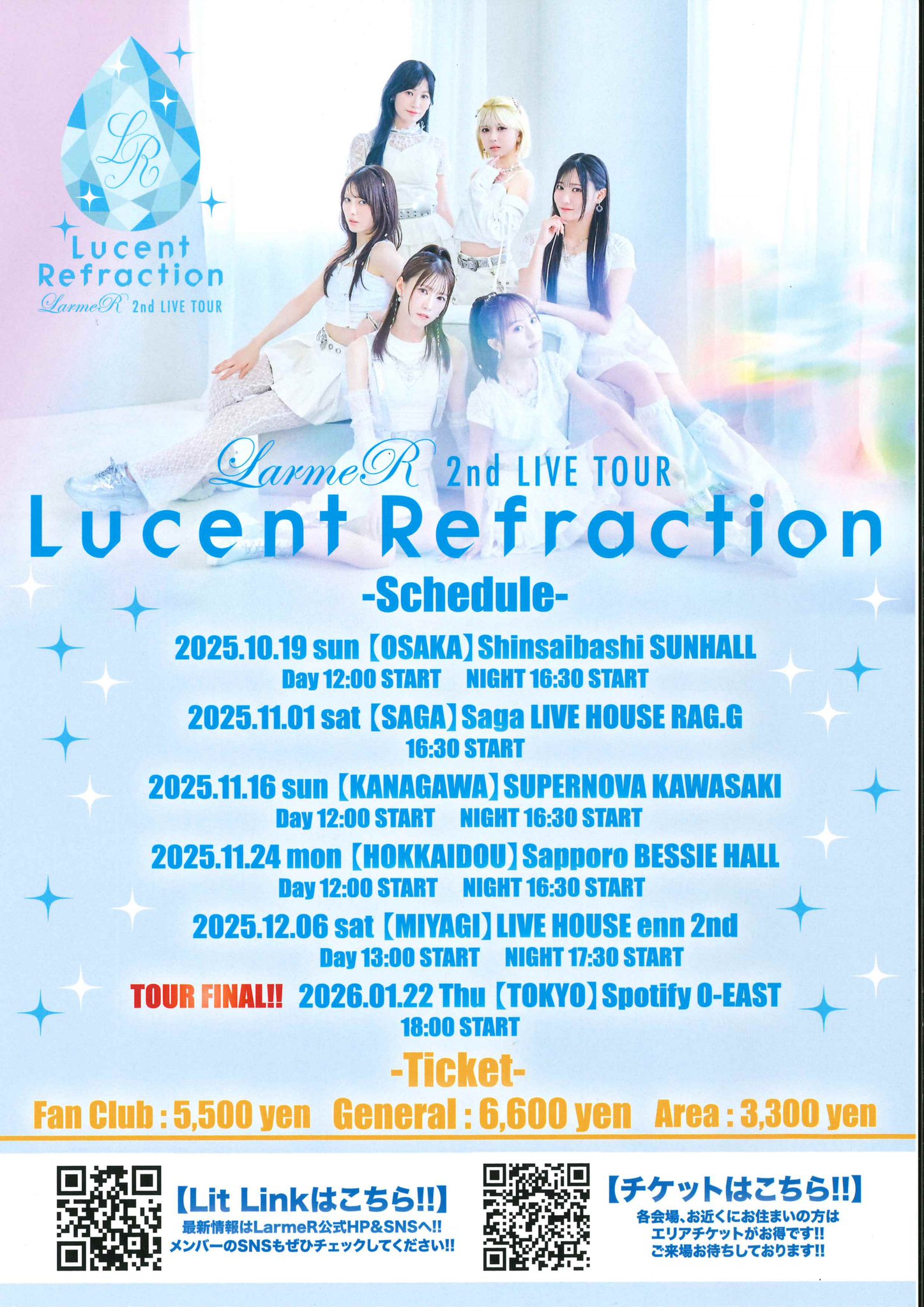 2025 10/19 [日] LarmeR 2nd LIVE TOUR 〜 Lucent Refraction 〜 イベント詳細 日付: 2025年10月19日 11:15 – 19:15 【昼】開場:11:15 / 開演:12:00 【夜】開場:15:45 / 開演:16:30 【前売】ファンクラブ:¥5,500 / ⼀般:¥6,600 / エリア割:¥3,300 (当⽇:+500) ※D代別