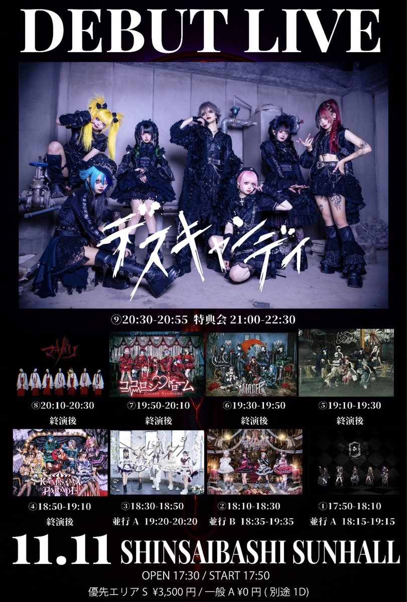 2025 11/11 [火] デスキャンディ始動主催 『その飴を舐めたら死ぬ。』 イベント詳細 日付: 2025年11月11日 17:30 – 22:00 OPEN 17:30 / START 17:50 優先エリアS ¥3,500 / 一般A ¥0 (各1D別途) ※入場順:優先⇒一般 出演:デスキャンディ / ココロシンドローム / DIAVEL / カミサマパレード / マザリ / めっ!/ アブソプ / ミラーシュカ / 白黒アリス