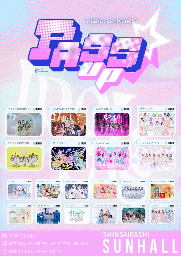2026 1/24 [土] PASS UP イベント詳細 日付: 2026年1月24日 10:15 – 22:00 OPEN 10:15 START 10:45 前方エリア¥3,500 / 一般¥2,000 / 女性¥1,000(各+1D代) ※当日券は各+¥500